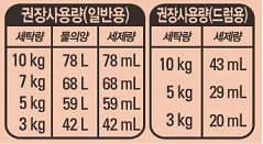 2. 일반 세탁기 및 드럼 세탁기 사용시 표기된 표준사용량을 참조하여 사용하십시오.