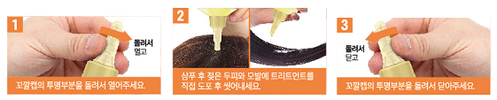 2. 샴푸후 젖은 두피와 모발에 트리트먼트를 직접 도포후 마사지 한 다음 물로 씻어내세요.