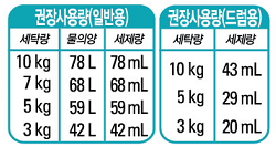 - 일반 세탁기 및 드럼세탁기 사용시 표기된 표준사용량을 참조하여 사용
