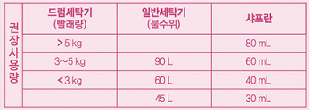 - 표준사용량 : 일반) 물 10L에 6.7ml / 드럼) 빨래량 4kg 에 60ml / 손빨래) 물 10L에 7ml, 물 30L에 20ml