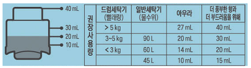 - 표준사용량 : 일반) 물 10L에 2.2ml / 드럼) 빨래량 4kg에 20ml