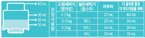 - 표준사용량 : 일반) 물 10L에 2.2ml / 드럼) 빨래량 4kg 에 20ml