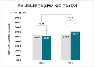 - FSO섭취 후 우측 대퇴사두근력(허벅지 앞쪽 근력)과 좌, 우 악력이 모두 유의하게 증가확인
