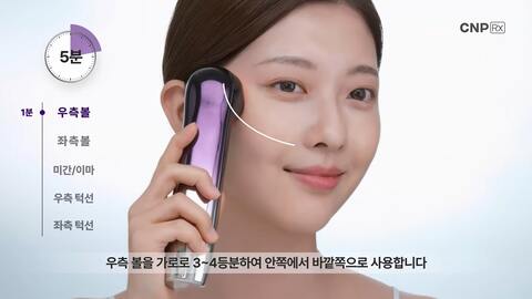 전원 버튼을 1초 이상 길게 눌러 켜주세요. 전원 버튼을 짧게 눌러 모드를 선택해 주세요.모드표시 *RF 모두 **RF+EMS 모드 전원모드변경(짧게 한번) 화살표 모양 버튼을 짧게 눌러 세기를 선택해 주세요. 처음 사용할 경우 사용법에 익숙해질 때 까지 강도 1로 사용해주세요.1분마다 삐 소리의 알림음이 울리면 부위를 바꾸어 사용합니다. 종료 5초전 알림음이 울립니다. 최초 피부접 으로 부터 5분후 알림음이 울리며 자동으로 전원이 꺼집니다. 세안 후 스킨케어 제품이 충분히 바른 후 사용해주세요. 세안 후 스킨케어 제품을 충분히 바른 후 사용해주세요. STEP 1. 우측 볼을 마사지 합니다. 우측 볼을 가로로 3~4등분 하여 안쪽에서 바깥쪽으로 사용합니다. STEP 2. 좌측 볼을 마사지 합니다. 죄측볼을 가로로 3~$등분 하여 안쪽에서 바깥쪽으로 사용합니다. STEP 3. 미간과 이마를 마사지 합니다. 미간을 세로로 2~3등분 하여 아래에서 위로 사용합니다. 이마를 가로로 2~3등분하여 안쪽에서 가깥쪽으로 사용합니다. STEP 4. 우측 턱선을 마사지 합니다. 우측 턱선밑부터 안쪽에서 바깥쪽으로 사용합니다. STEP 5. 좌측턱선을 마사지 합니다. 좌측 턱선 밑부터 안쪽에서 바깥쪽으로 사용합니다. (헤드의 전극 전체 면적이 피부가 잘 닿을 수 있도록 밀착하여 사용해주세요. ) 5분 후 기기는 자동으로 전원이 꺼집니다. 단 5분동안 빠르고 강력하게 3,000번의 멀티 3D샷TM 으로 피부 나이를 되돌리는 탄력케어 효과 탄력, 주름 페이스 라인 까지 한번에 더욱 세밀하고 강력한 안티에이징 케어를 시작하세요. 사용중에 건조함이 느껴진다면 스킨케어 제품을 추가로 도포해주세요. 피부에 기기의 열감이 충분히 느껴질수있도록 서서히 움직이면서 사용해주세요. 눈꺼플, 입술, 귀 등 민감 부위에서는 사용하지 마세요. 하루 권장시간은 5분입니다.