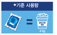 * 표준사용량: 세탁물 4Kg 이하: 캡술 1개(적은 빨래량), 세탁물 4kg초과~ 7Kg이하: 캡슐 2개(보통 빨래량), 세탹물 7Kg초과: 캡술 3개(많은 빨래량)