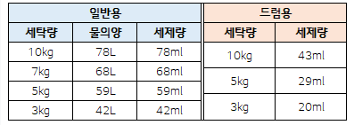 2. 일반 세탁기 및 드럼 세탁기 사용시 표기된 표준사용량을 참조하여 사용하시오.