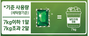 - 표준사용량 : 세탹물 7Kg 이하 캡술 1개(보통 빨래량), 세탁물 7kg 초과 캡슐 2개(많은 빨래량)