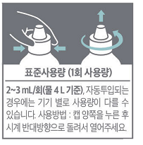 - 표준 사용량 : 2~3mL/회(물 4 L 기준), 자동투입되는 경우에는 기기별로 사용량이 다를 수 있습니다.