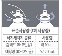 - 표준 사용량 : 오염의 정도와 식기의 개수 등에 따라 세제 사용량을 정할 수 있습니다.