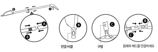 1) 핸들(A)의 봉 부분을 몸체(B) 연결부 구멍에 맞게 끼우세요.