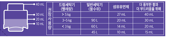 * 표준사용량 : 일반) 물 10L에 2.2ml / 드럼) 빨래량 4kg 에 20ml