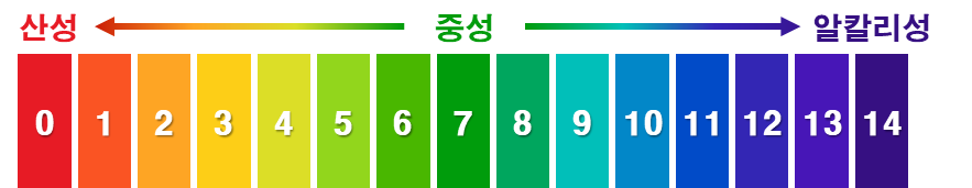 pH(산성도)는 0~14까지 측정하고 있으며, 7(중성)을 기준으로 0으로 가까워질수록 산성, 14로 가까워질수록 알칼리성을 의미합니다.