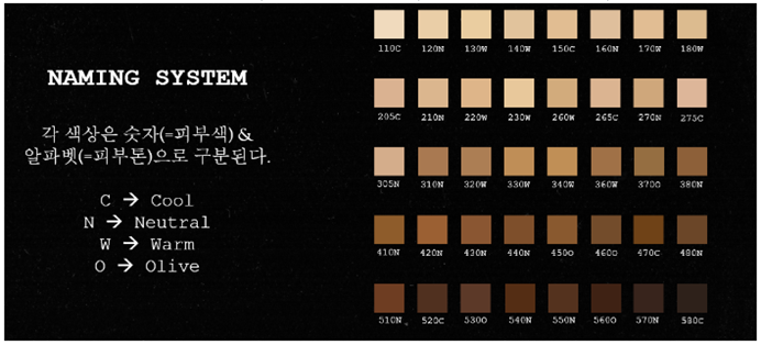 알파벳 : 피부 톤을 나타냄. C 쿨 톤, N 뉴트럴, W웜 톤, O 올리브 톤